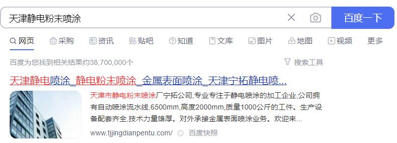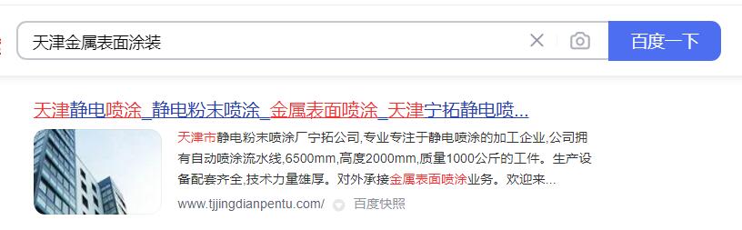 天津?qū)幫仂o電噴涂加工廠網(wǎng)站SEO優(yōu)化案例天津市靜電粉末噴涂廠寧拓公司,專業(yè)專注于靜電噴涂的加工企業(yè),公司擁有自動(dòng)噴涂流水線,mm,高度mm,質(zhì)量公斤的工件。生產(chǎn)設(shè)備配套齊全,技術(shù)力量雄厚。對外承接金屬表面噴涂業(yè)務(wù)。歡迎來電洽談業(yè)務(wù)。